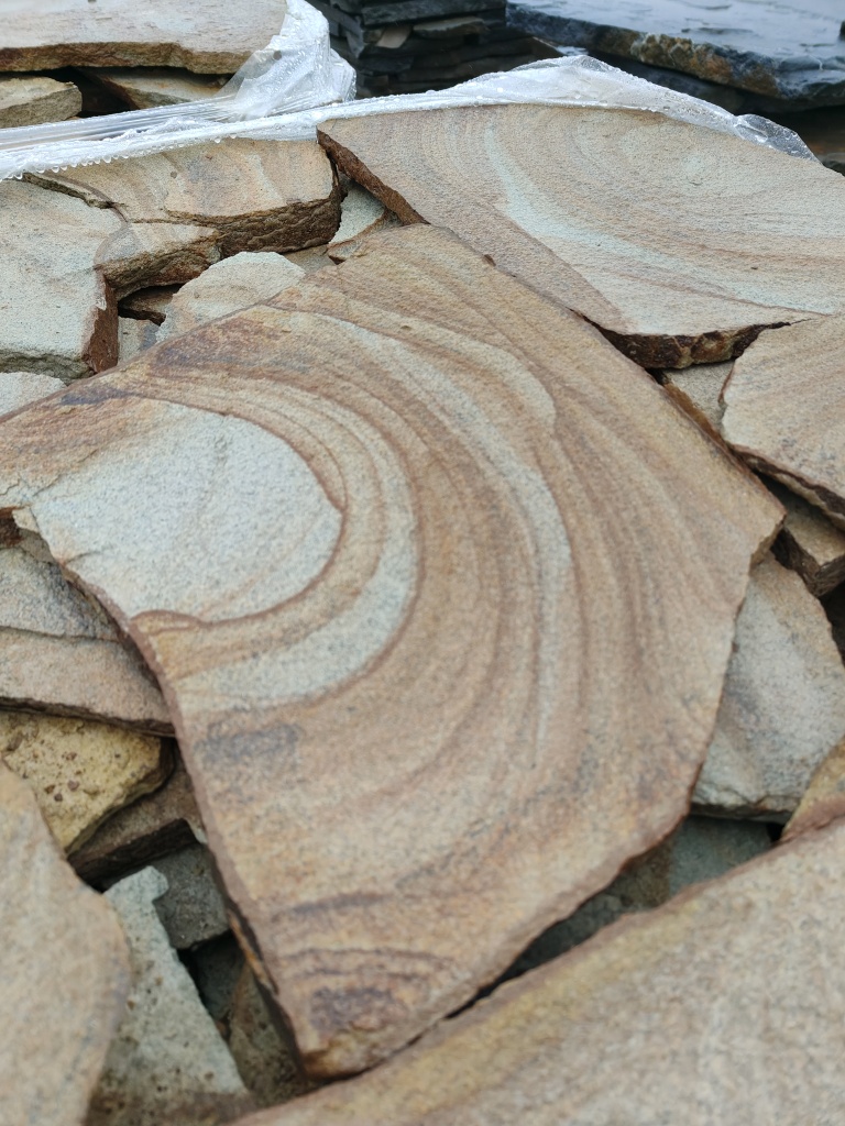 Песчаник жёлтый с разводами - для работ по облицовке цоколя, отмостки, стен, фундаментов, заборов.